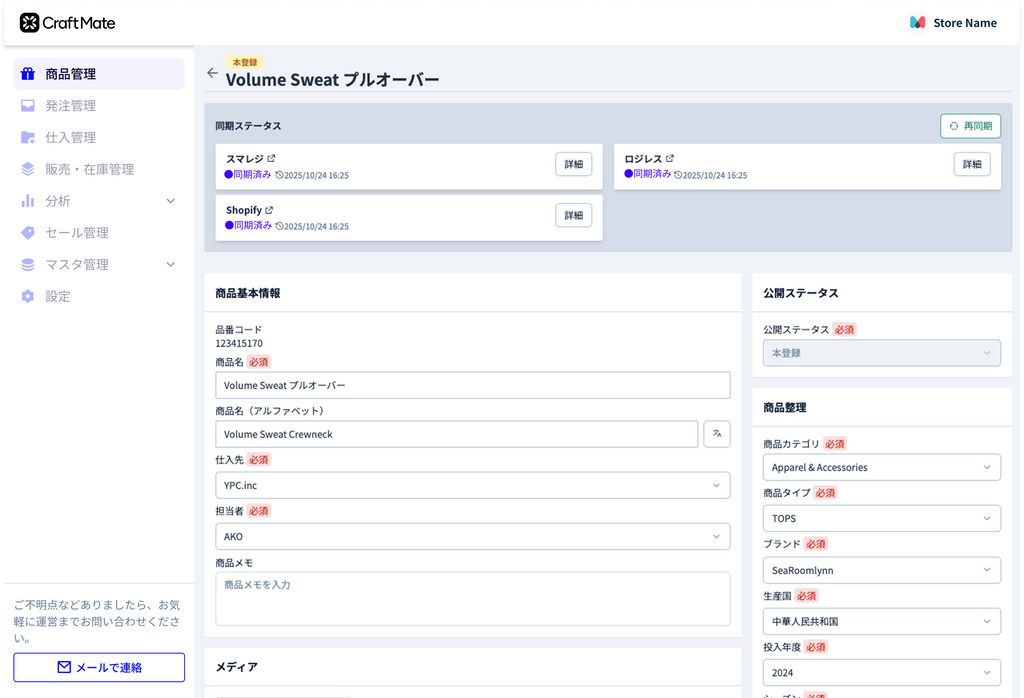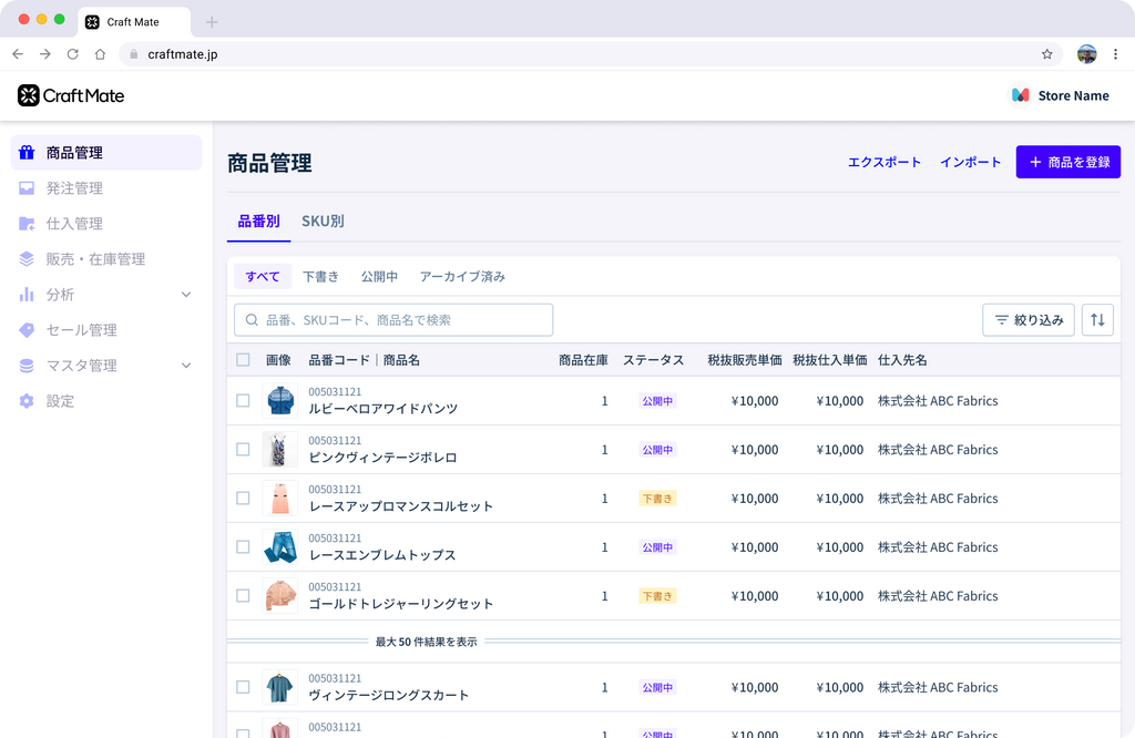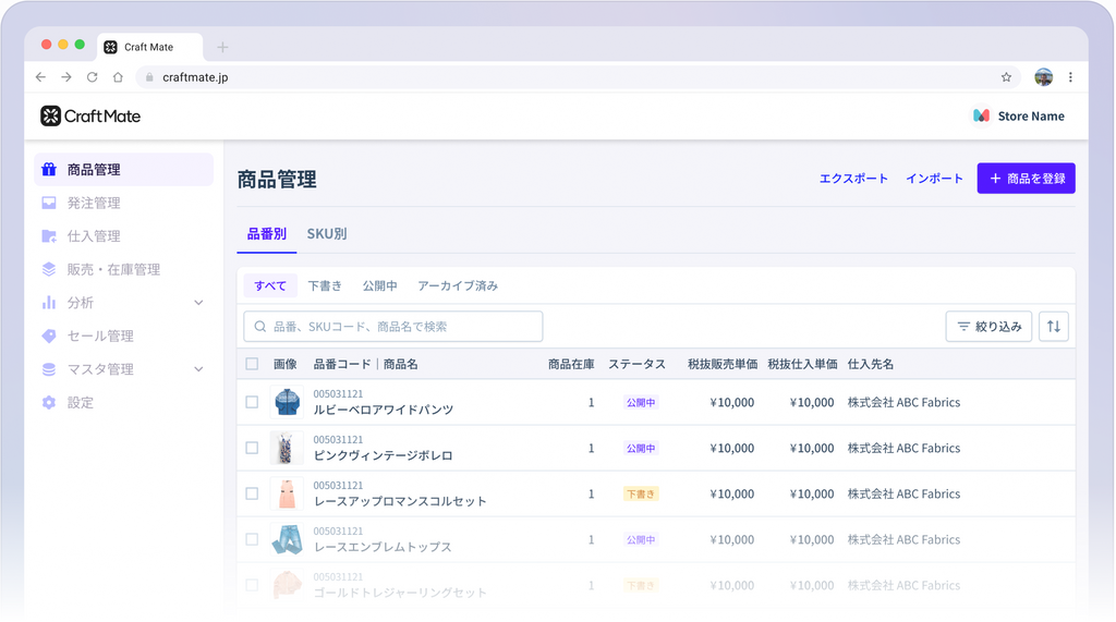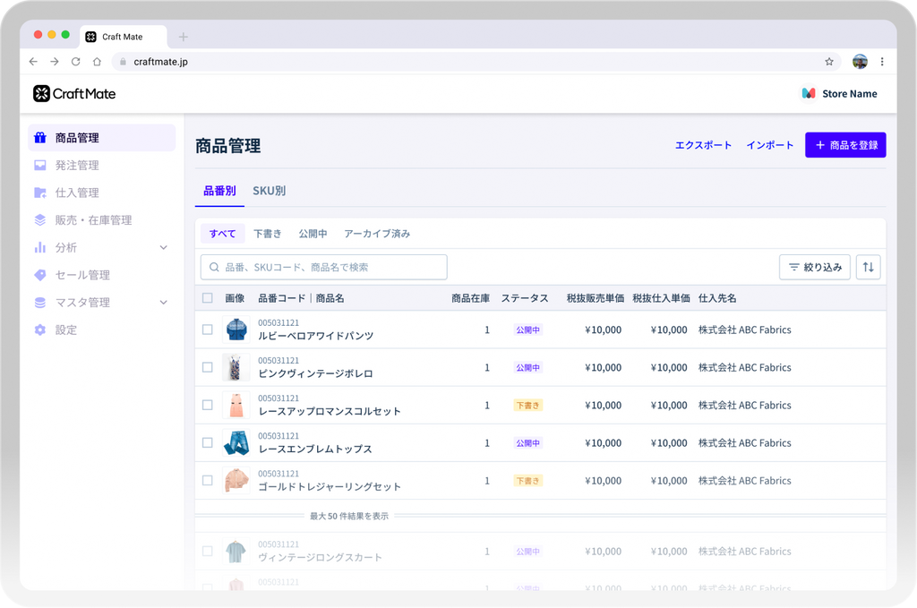 CraftMateは、システムをまたいだマスタ管理や、分散しがちなEC・店舗の販売・