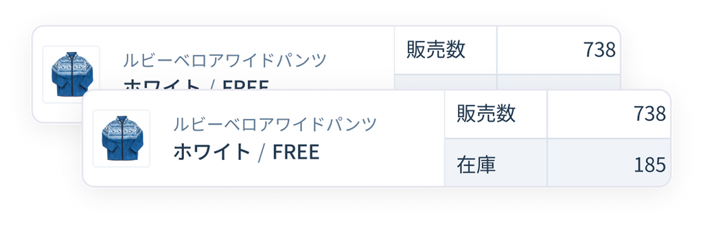 EC、倉庫、店舗ごとの在庫状況と販売チャネルごとの商品単位の販売数が、管理画面からひと目で確認できます。